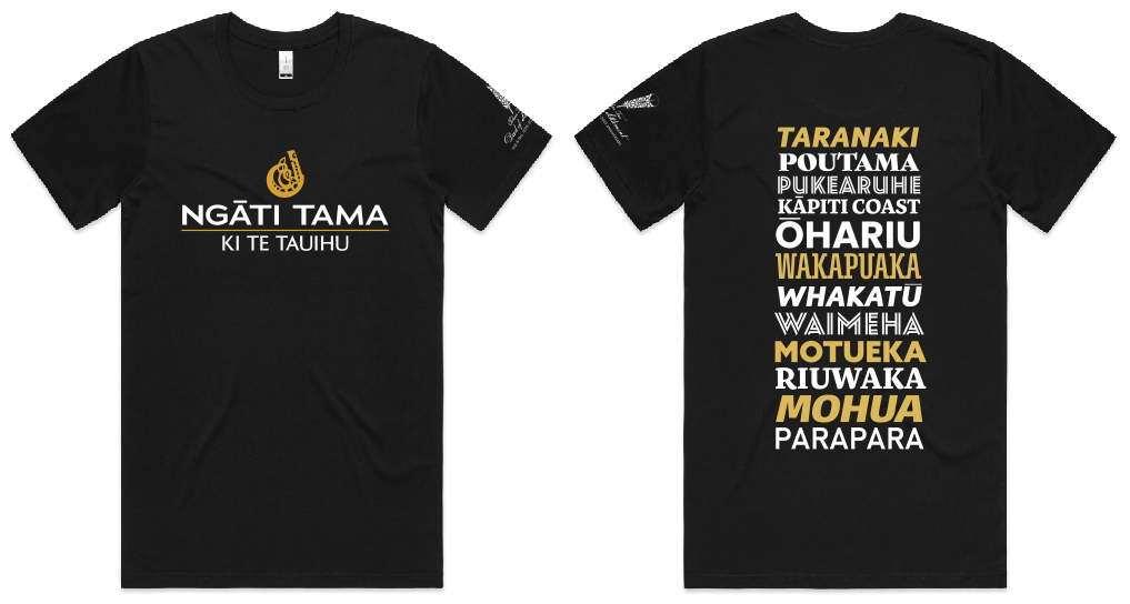 • Ngati Tama gold & white print (front + back) and feather print (sleeve)