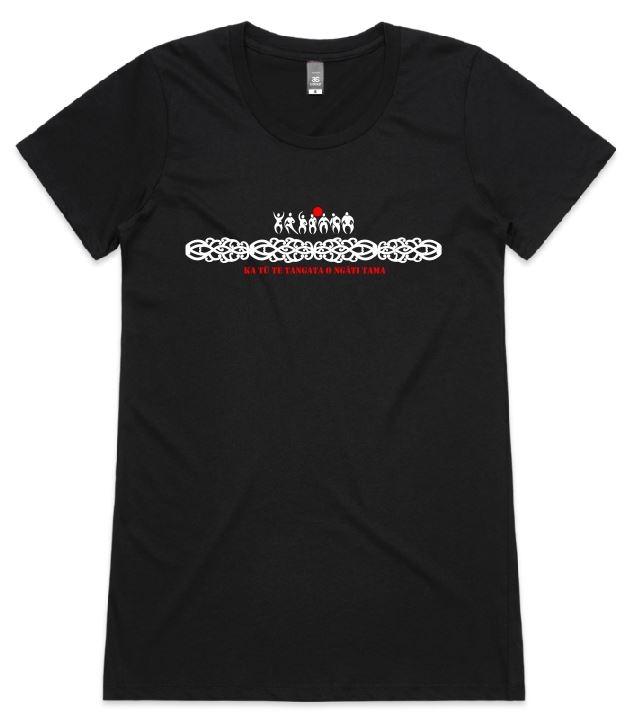 A photograph on the Tama building of people using taiaha is the basis of this design.